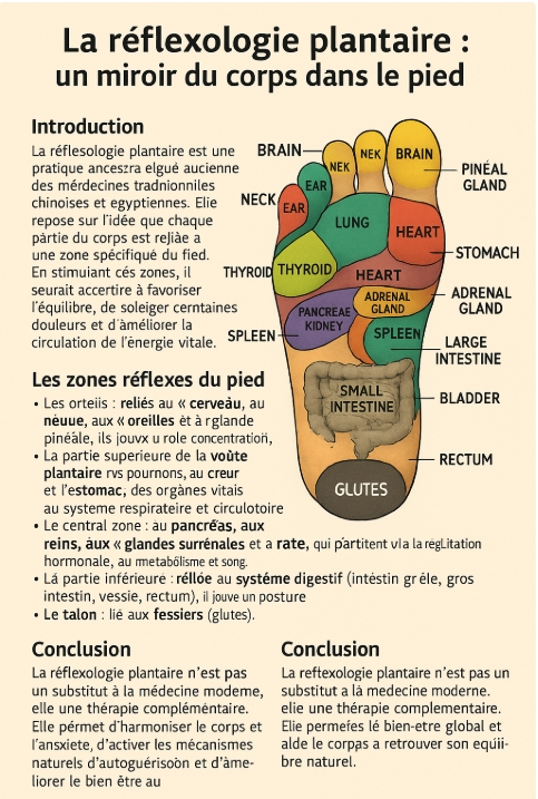 La réflexologie plantaire est une pratique ancestrale issue des médecines traditionnelles chinoises et égyptiennes. Elle repose sur l’idée que chaque partie du corps est reliée à une zone spécifique du pied. En stimulant ces points réflexes, on peut rétablir l’équilibre énergétique, soulager certaines douleurs et favoriser un état de bien-être général.