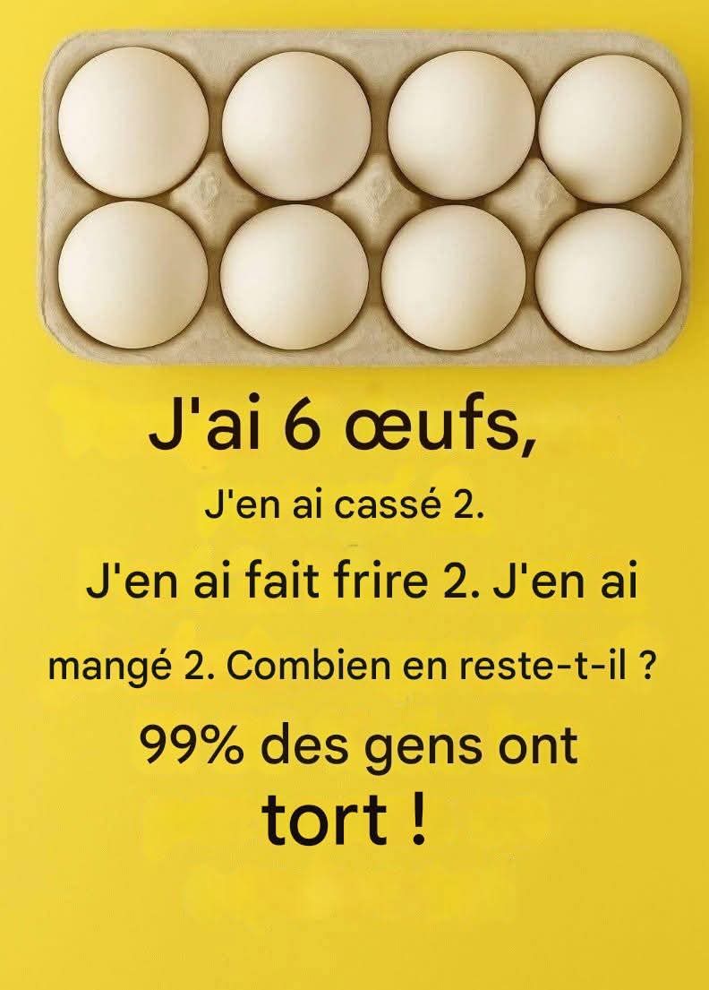 🤯 Et en effet ! La plupart des utilisateurs répondent incorrectement sans réfléchir. Certains disent qu’il reste 0 œuf, d’autres 4, d’autres 2… mais quelle est la bonne réponse ?
